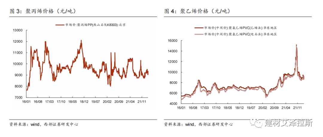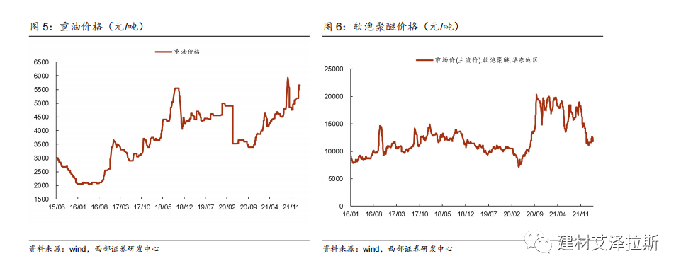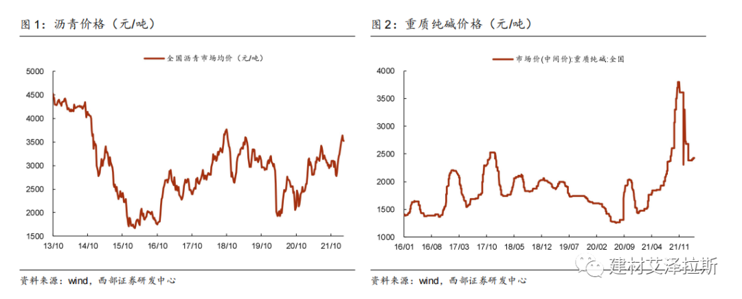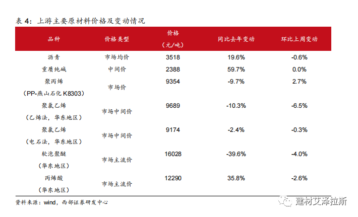 2)玻璃:本周全国白玻均价2453.88 元/吨,环比上涨2.3%,同比去年上升19.3%。玻璃库存4124万重箱,环比上周上涨8.24%,同比去年上升5.53%;本周末玻璃产能利用率为72.05%,同比去年上涨1.08%。