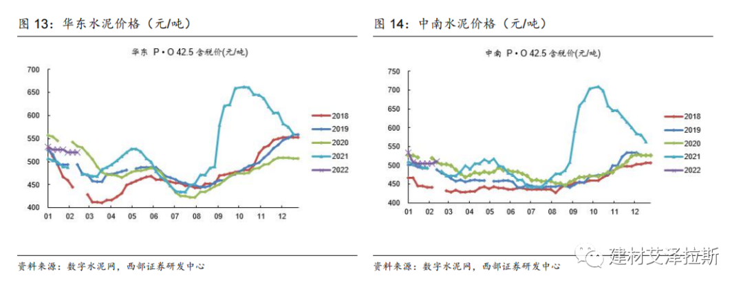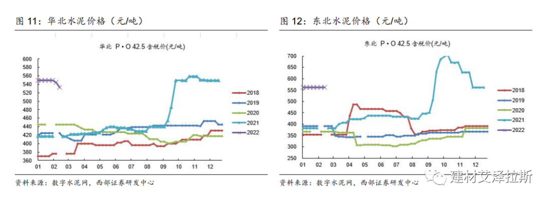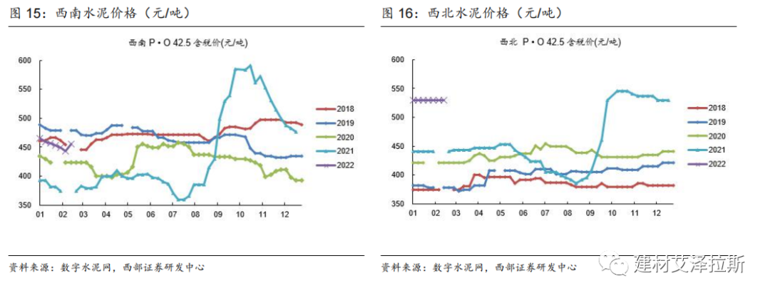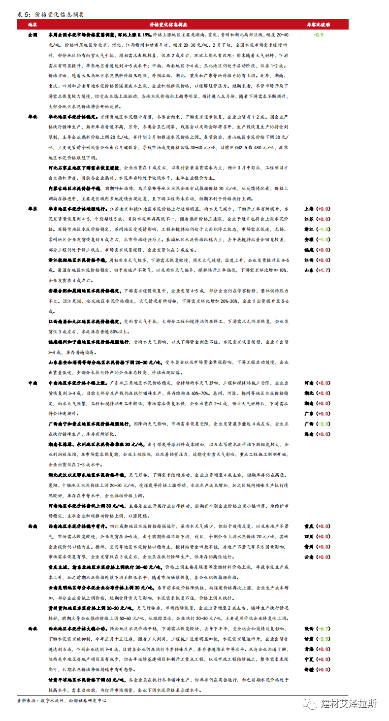 本周全国水泥市场价格震荡调整,环比上涨0.19%。价格上涨地区主要是湖南、重庆、贵州和湖北局部区域,幅度20-40元/吨;价格回落地区为北京、河北、江西赣州和甘肃平凉,幅度20-30元/吨。2月下旬,全国水泥市场需求缓慢回升,部分地区仍有雨雪天气干扰,周初需求表现较差,仅在2成左右,环比上周未有改观;周末随着天气好转,下游需求有明显提升,华东地区普遍达到4-5成水平;中南、西南地区3-4成;三北地区仍处于启动阶段,仅在1-2成。价格方面,随着长三角地区水泥熟料价格三连涨,外围江西、湖北、重庆和广东等地价格也均有上调。此外,湖南、重庆、四川和云南等地水泥价格因煤炭成本上涨,企业积极推涨价格,以缓解经营压力。短期来看,尽管市场开局下游需求恢复较为缓慢,但受成本端上涨驱动,各地水泥价格向上趋势明显,预计进入三月份,随着下游需求不断提升,大部分地区水泥价格将会开始反弹。