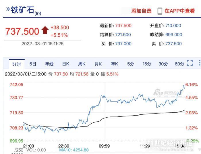 2月下旬以来,年内显著走高的铁矿石价格,在短暂回落之后再度回升。截至3月1日下午收盘,国内铁矿石期货价格上涨5.51%,收报737.5元/吨。