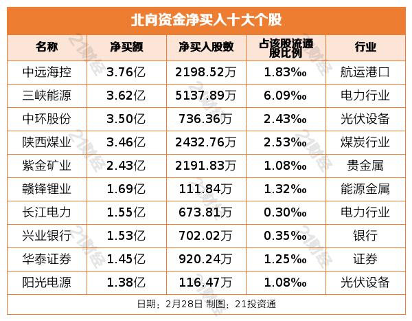 个股方面,北向资金净买入中远海控(601919.SH)、三峡能源(600905.SH)、中环股份(002129.SZ)、陕西煤业(601225.SH)、紫金矿业(601899.SH)居前,其中,中远海控被净买入3.76亿元,三峡能源被净买入3.62亿元,中环股份被净买入3.50亿元,陕西煤业被净买入3.46亿元,紫金矿业被净买入2.43亿元。
