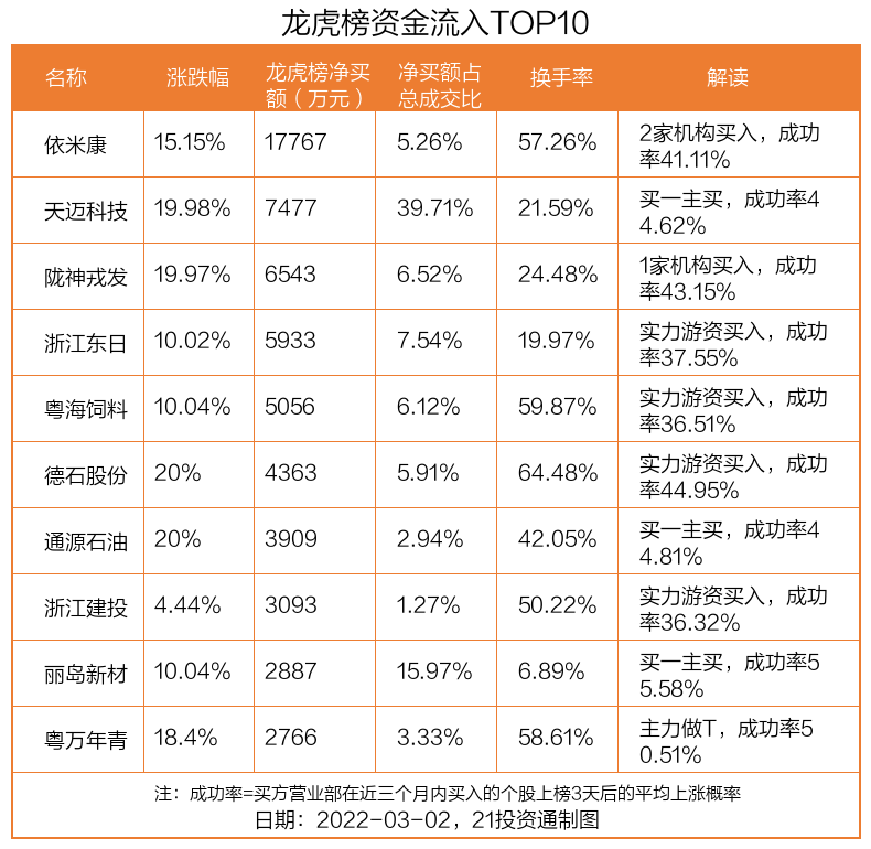 3月2日,上证指数下跌0.13%,深证成指下跌1.05%,创业板指下跌1.77%。盘后龙虎榜数据显示,共有32只个股因当日异动登上龙虎榜,资金净流入最多的是依米康(300249.SZ),达1.78亿元。