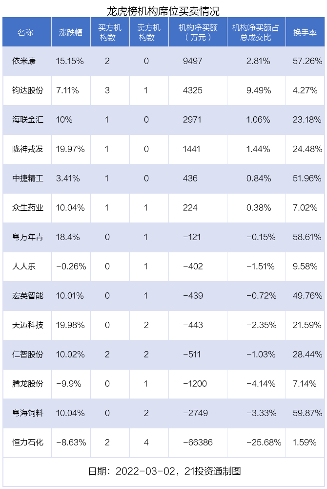 3月2日,14只个股龙虎榜出现了机构的身影,机构合计净卖出5.34亿元。具体来看,机构净买入6股,净卖出8股。