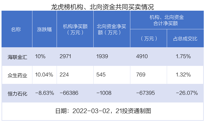值得注意的是,机构和北向资金共同净买入了海联金汇、众生药业等2股;共同净卖出了恒力石化。