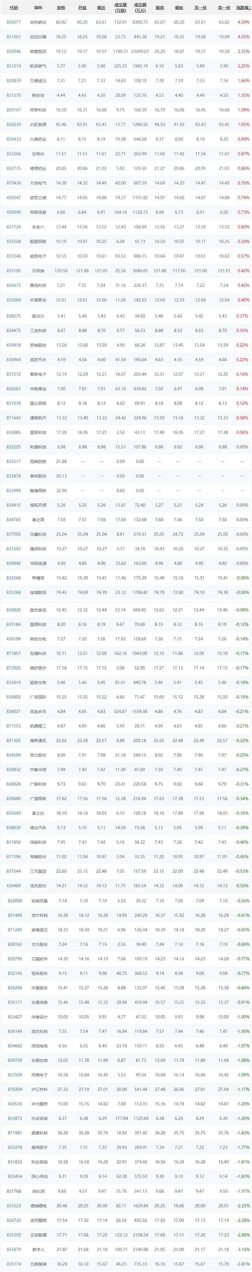 其中,吉林碳谷(836077)涨幅居首,上涨4.59%;创远仪器(831961)涨幅居次,上涨4.55%;五新隧装(835174)跌幅居首,下跌3.81%;数字人(835670)涨幅居次,下跌3.16%;利通科技(832225)、恒拓开源(834415)等平盘。