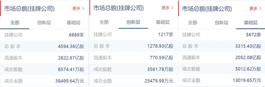 截至3月1日收盘,今日成交金额为3.85亿元,创新层成交金额为2.55亿元,基础层成交金额为1.30亿元;今日成交股数为8574.41万股,创新层成交股数为3561.78万股,基础层成交股数为5012.62万股。