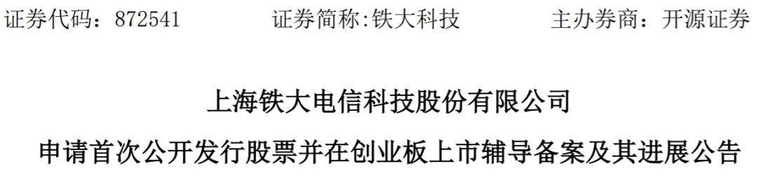 2022年2月24日,铁大科技向中国证券监督管理委员会上海监管局提交了上海铁大电信科技股份有限公司首次公开发行股票并在创业板上市辅导备案材料,辅导机构为开源证券。