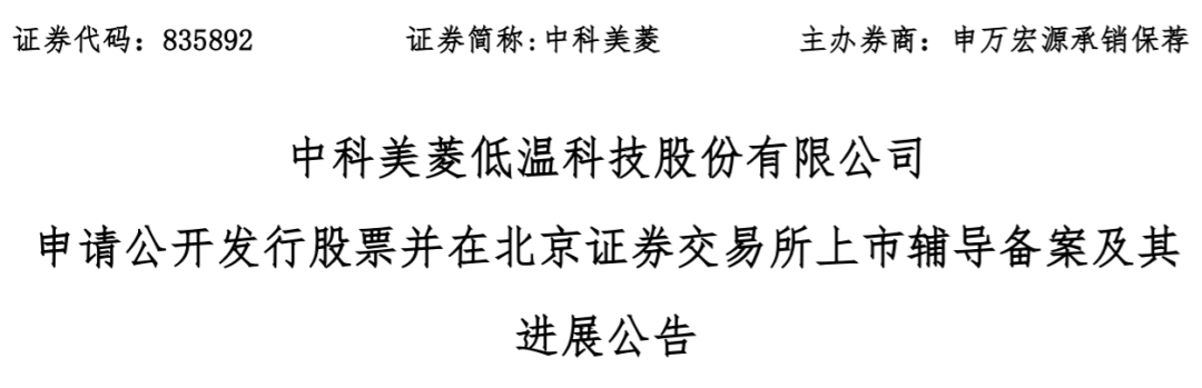 中科美菱公告显示,2022年2月28日,公司与申万宏源证券承销保荐有限责任公司签署了《中科美菱低温科技股份有限公司向不特定合格投资者公开发行股票并在北京证券交易所上市之辅导协议》。