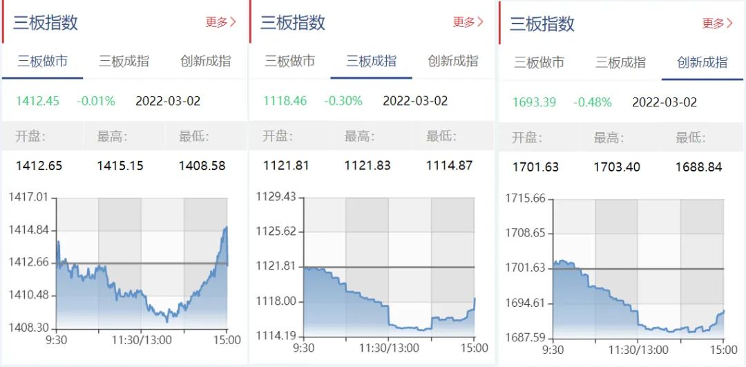 截至3月2日收盘,三板做市报1412.45点,下降0.01%;三板成指报1118.46点,下跌0.30%;三板创新报1693.39点,下跌0.48%。