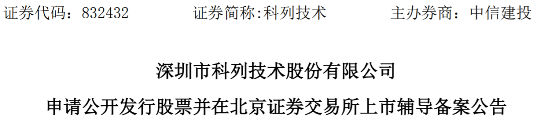公告显示,2022 年3月1 日,科列技术与中信建投证券股份有限公司签署《深圳市科列技术股份有限公司与中信建投证券股份有限公司关于股票向不特定合格投资者公开发行并上市之辅导协议》。