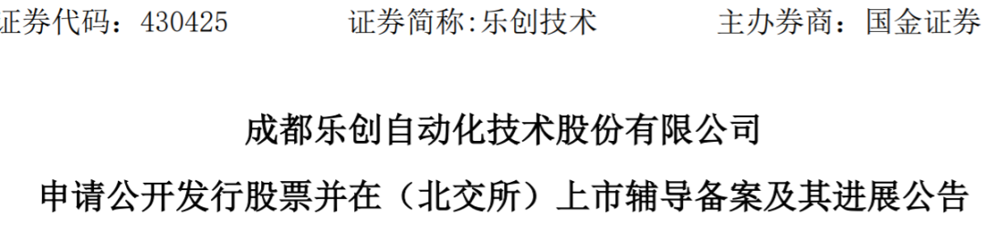 乐创技术公告显示,2022年2月25日,成都乐创自动化技术股份有限公司与国金证券股份有限公司签署《成都乐创自动化技术股份有限公司与国金证券股份有限公司关于公开发行股票并在北京交易所上市之辅导协议》,辅导机构为国金证券股份有限公司。