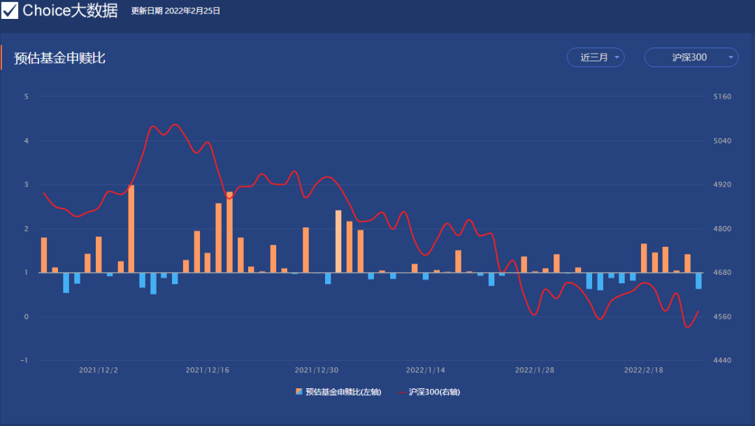 截至2月25日,预估基金申赎比为0.62,相较于前一周统计数据,上周基金申赎比数值下跌波动较大。