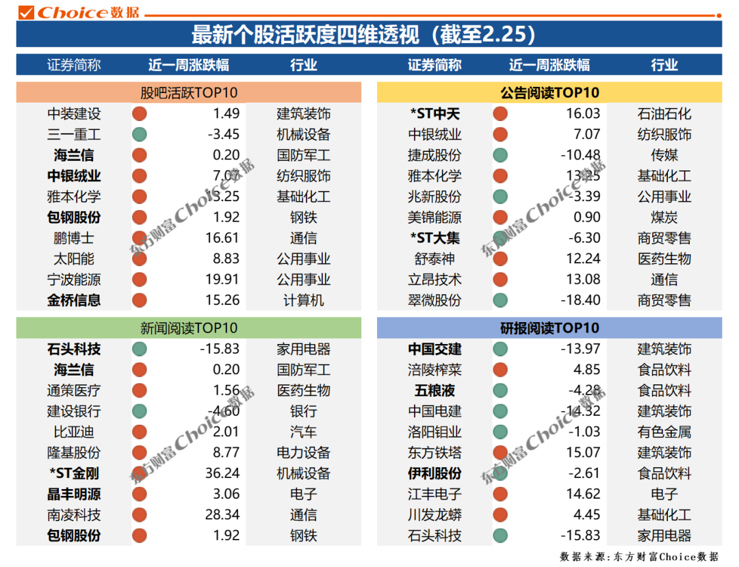 Choice另类数据中心显示,截至2月25日,个股活跃度四维透视中,股吧活跃度排名第一的是建筑装饰行业的中装建设(1.49%),公告阅读排名第一的是石油石化行业的*ST乐材(16.03%),新闻阅读数、研报阅读数排名第一的分别是家用电器行业的石头科技(-15.83%)和建筑装饰行业的中国建筑(-13.97%)。