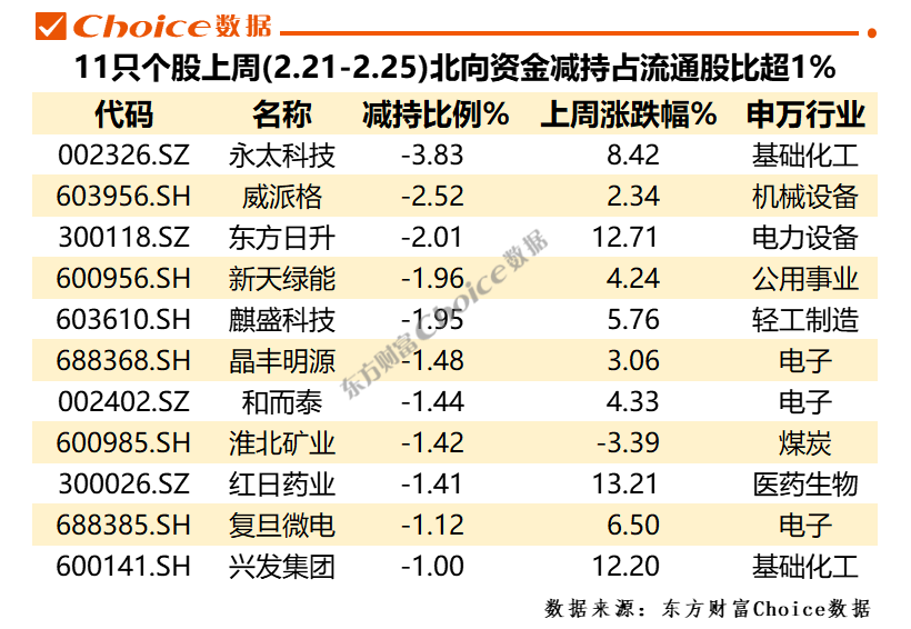 北上资金减持占流通股比超1%的股票有11只,其中永太科技、威派格和东方日升减持比例居前。