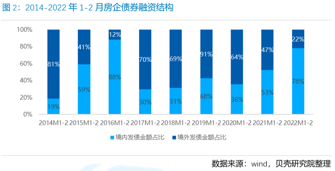 2、2022年1-2月房企债券融资境内债成绝对主导,境外债占比降至22%