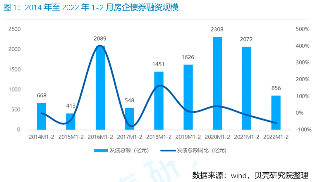 1、2022年1-2月房企债券发债规模不足千亿,同比下降59%