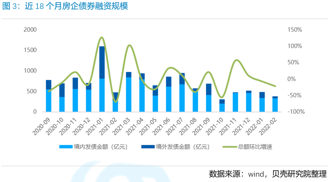 1、2022年房企连续两月债券融资规模低500亿,美元债回售增加房企流动性风险