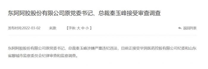 3月2日,华润医药官网披露了一则消息。东阿阿胶原党委书记、总裁秦玉峰涉嫌严重违纪违法,目前正接受审查调查。