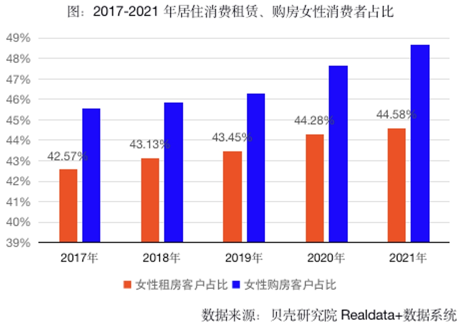 居住消费能力不仅是个人财富实力的体现,也是传统性别分工被打破的象征,虽然从存量上看中国女性拥有住房比例仍低于男性,但受多种力量推动,女性消费潜力得到进一步释放。