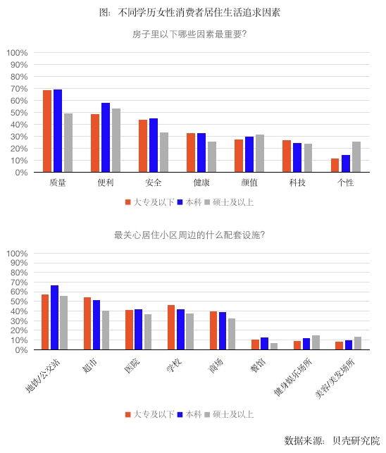 以高学历女性消费者为例,调查显示,这一群体的居住需求层次相对较高,学历越高的女性消费者表现出越强烈的“悦己”特点,在对美好居住生活的追求中,就房子而言,学历越高的女性越关注颜值、个性这些自我满足的因素;就社区生活而言,学历越高的女性对文体娱、美容/美发这类享受生活的需求愈强烈。