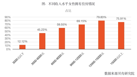贝壳研究院调查显示,收入水平提升、观念独立决定女性消费力。调查结果显示,收入水平越高的女性群体,住房拥有率越高,收入水平(税后到手)3000元以下的群体名下有房的比例为12.12%,而月收入为15000元以上的群体住房拥有率达到75.91%。虽然男女收入水平仍有差距,但良好的教育水平、良好的职业发展成为越来越多现代女性的追求,且从长期看随着女性年龄的增长,男女收入水平差距也会缩短,推动女性居住消费增长。