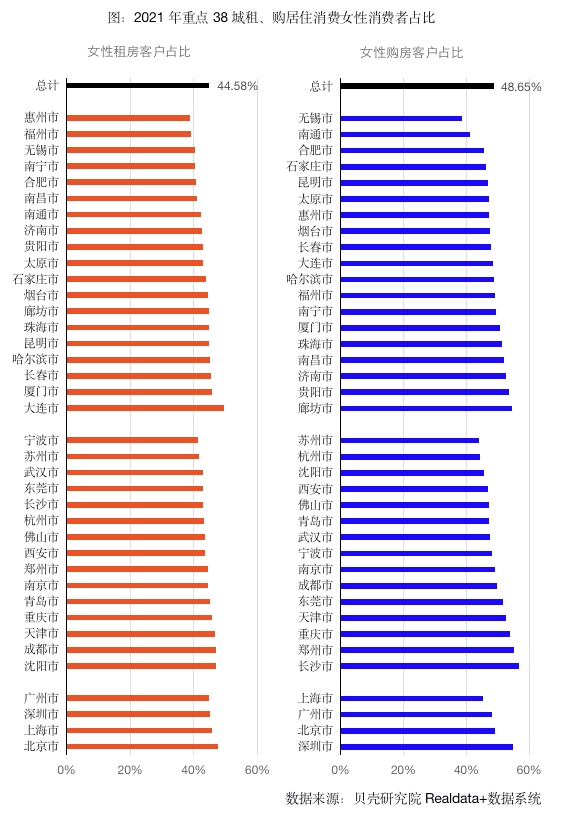 不过,不同城市之间存在差异,个别城市女性居住消费潜力不断释放,女性消费者占比提升较快。新一线城市中,东莞、杭州、沈阳三城购房女性消费者表现显眼,女性客户占比增长较快,2021年占比分别达到51.68%、44.27%和45.75%,较2018年分别上升了11.37个百分点、9.98个百分点和8.66个百分点,增速高于同等级城市平均水平。租房女性消费者占比增长较快的城市有西安、宁波,2021年分别达到了43.51%和40.86%,较2018年分别上升了4.61个百分点和4.45个百分点。