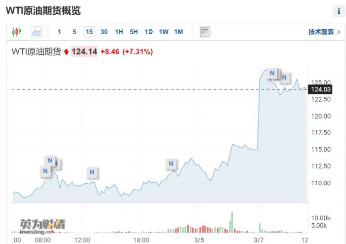 北京时间3月7日,国际油价继续冲高,布伦特原油价格一度上涨18%至139.13美元。截至发稿,布伦特原油涨8.44%,每桶报128美元;WTI原油涨7.31%,每桶报124美元。