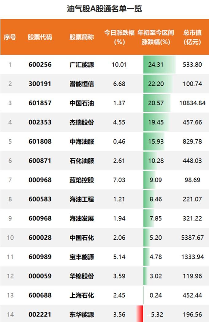 此外,原油类股票今年以来涨幅也颇大。广汇能源、潜能恒信、中国石油、杰瑞股份等今年来涨幅均超过20%。万亿市值的中国石油最近走势强劲,已经成为股吧的热门话题之一。
