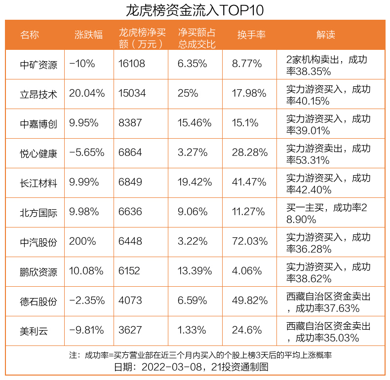 3月8日,上证指数下跌2.35%,深证成指下跌2.62%,创业板指下跌1.8%。盘后龙虎榜数据显示,共有50只个股因当日异动登上龙虎榜,资金净流入最多的是中矿资源(002738.SZ),达1.61亿元。