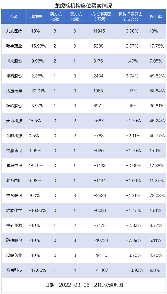 其中,机构净买入金额最多的是九安医疗(002432.SZ),当日收盘下跌10%,换手率为13%。前五大买卖营业部中有3家机构,合计净买入11945万元,占总成交金额的3.90%。