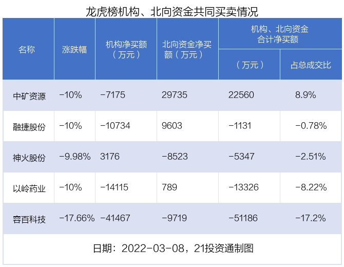 值得注意的是,机构和北向资金共同净卖出了容百科技;在中矿资源,融捷股份,以岭药业,神火股份上出现分歧,机构净卖出中矿资源7175.11万元,北向资金净买入2.97亿元;机构净卖出融捷股份1.07亿元,北向资金净买入9603.34万元;机构净卖出以岭药业1.41亿元,北向资金净买入789.01万元;机构净买入神火股份3176.15万元,北向资金净卖出8523.07万元。