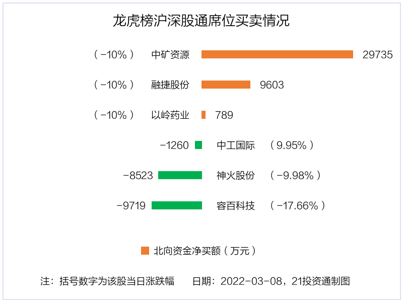 3月8日,北向资金参与龙虎榜中的个股共有6只,合计净买入2.06亿元。其中沪股通净卖出1 股,金额为9718.88万元;深股通净买入3 股,净卖出2 股,合计净买入3.03亿元。