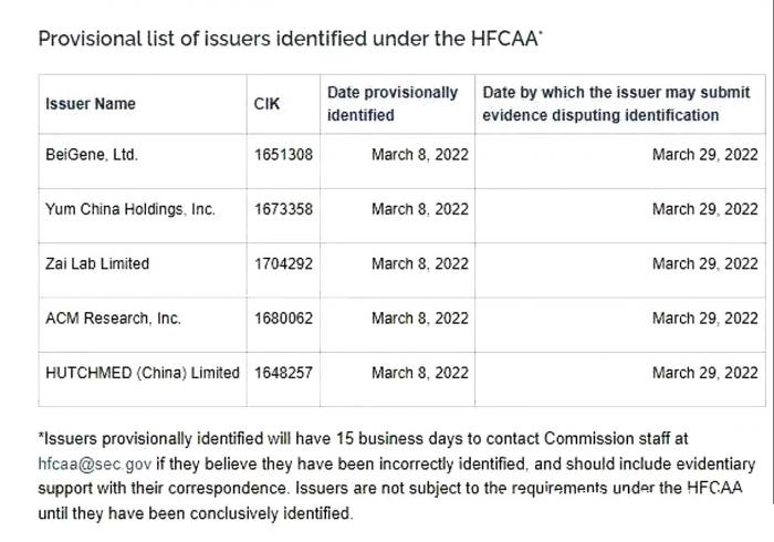 3月8日,百济神州、百胜中国、再鼎医药、盛美半导体、和黄医药被美国证券交易委员会(SEC)纳入“临时退市清单”。