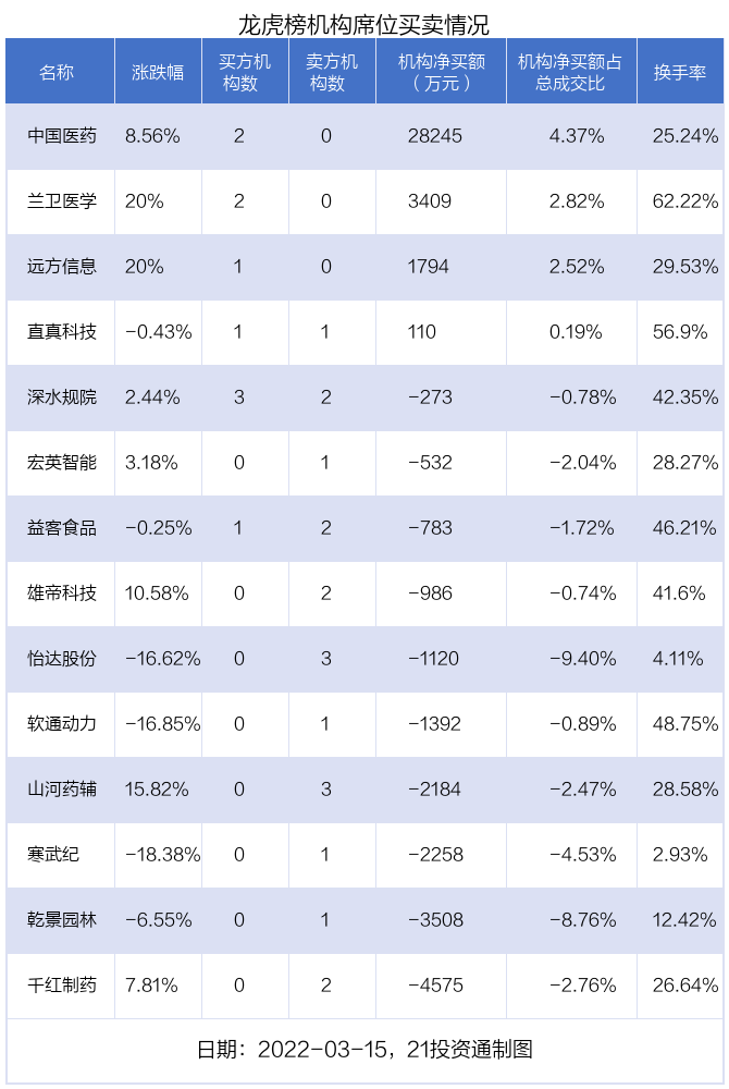 3月15日,14只个股龙虎榜出现了机构的身影,机构合计净买入1.59亿元。具体来看,机构净买入4股,净卖出10股。