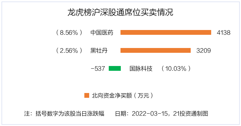 3月15日,北向资金参与龙虎榜中的个股共有3只,合计净买入6810.35万元。其中沪股通净买入2 股,合计金额为7347.4万元;深股通净卖出1 股,金额为537.05万元。
