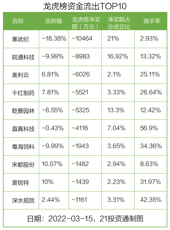 而龙虎榜中资金净流出最多的是寒武纪(688256.SH),被净卖出为1.05亿元,占总成交金额的21%。寒武纪收盘下跌18.38%,换手率为2.93%。