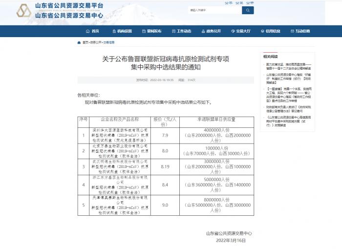 3月16日,山东省公共资源交易中心公布鲁晋联盟新冠抗原检测试剂专项集采中选结果。中选企业分别为:华大因源(7.9元/人份)、万泰生物(8元/人份)、明德生物(8.19元/人份)、东方生物(8.4元/人份)、天津博奥赛斯(9元/人份),前述公司的承诺联盟单日供应量分别为:400万人份、10万人份、300万人份、500万人份、800万人份。