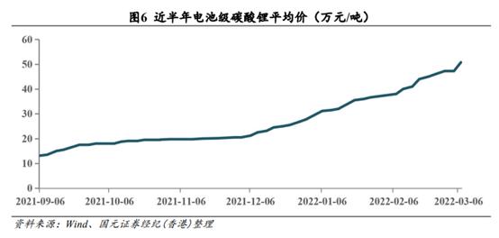 从上下游产业链来看,锂板块下游终端需求旺盛,新能源汽车开年以来继续实现产销两旺,多家车企宣布提价;上游量价齐升,碳酸锂价格突破50万元大关,同时部分锂行业龙头一季度业绩大增,传递积极信号,叠加前期板块股价的回调,2022年锂行业景气度似乎有望持续。
