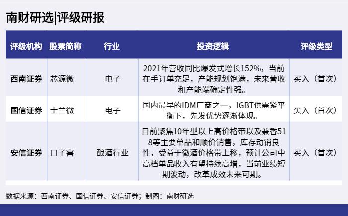 3月14日-15日,证券公司研究报告首次覆盖的上市公司中,包括芯源微、士兰微和口子窖,分属于电子半导体和酿酒行业。