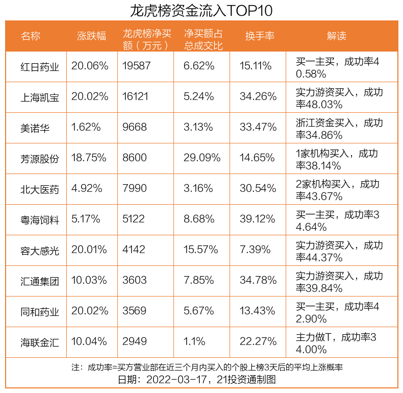 45只上榜的龙虎榜个股中,24只个股被净买入,21只个股被净卖出。其中,资金净买入最多的是红日药业,达1.96亿元,占总成交金额的6.62%。红日药业当日收盘上涨20.06%,换手率为15.11%。