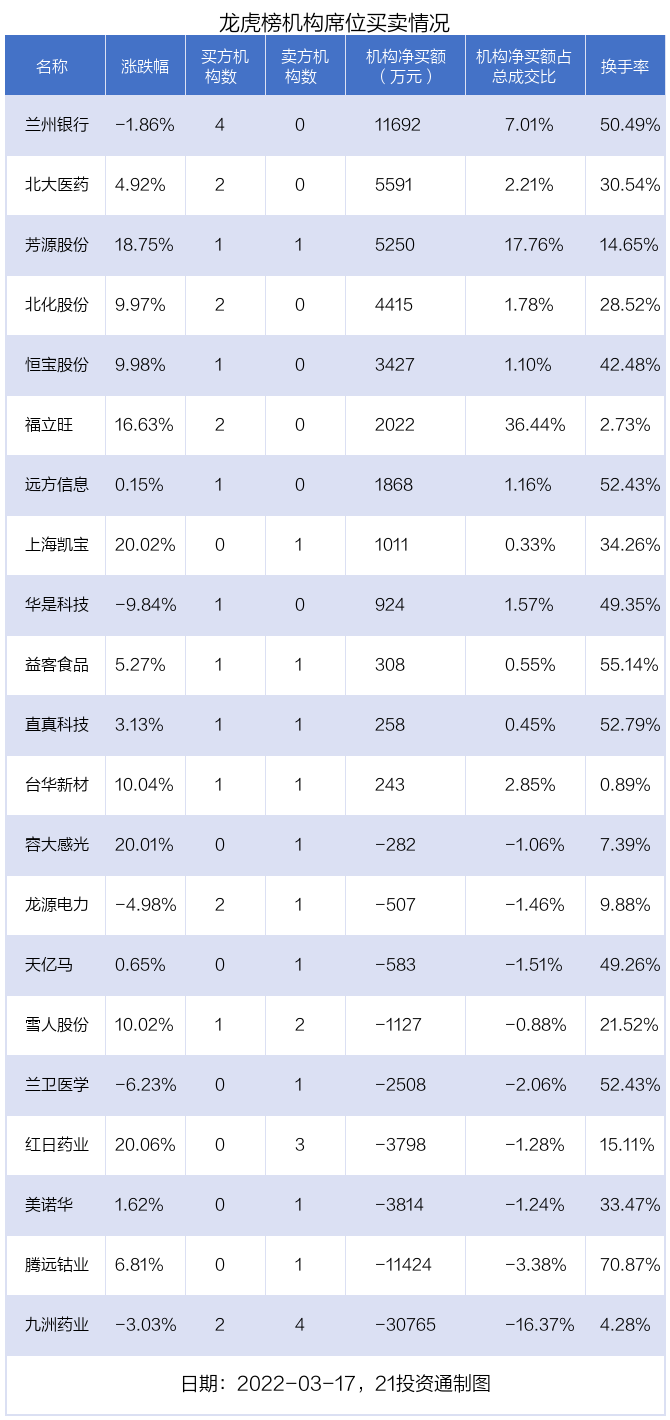 3月17日,21只个股龙虎榜出现了机构的身影,机构合计净卖出1.78亿元。具体来看,机构净买入12股,净卖出9股。
