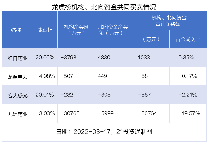 值得注意的是,机构和北向资金共同净卖出了容大感光、九洲药业;在红日药业、龙源电力上出现分歧,机构净卖出红日药业3797.77万元,北向资金净买入4830.48万元;机构净卖出龙源电力507.31万元,北向资金净买入449.06万元。