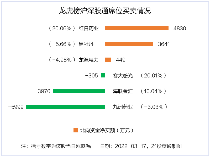 3月17日,北向资金参与龙虎榜中的个股共有6只,合计净卖出1353.09万元。其中沪股通净买入1 股,净卖出1 股,合计净卖出2358.04万元;深股通净买入2 股,净卖出2 股,合计净买入1004.94万元。