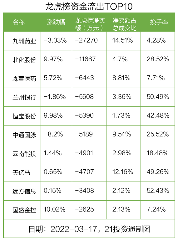 而龙虎榜中资金净流出最多的是九洲药业(603456.SH),被净卖出为2.73亿元,占总成交金额的14.51%。九洲药业收盘下跌3.03%,换手率为4.28%。