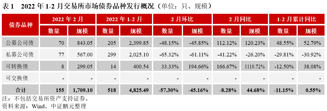 2022年2月份,我国交易所市场共发行信用债券155只,发行规模1,709.10亿元。交易所信用债券发行环比分别下降57%和45%,同比分别下降8%和增长45%。2月份,公募公司债发行70只,发行规模843.05亿元,环比分别下降48%和46%,同比分别增长112%和120%;私募公司债发行77只,发行规模567.00亿元,环比分别下降65%和61%,同比分别下降41%和26%。可转债发行8只,发行规模299.05亿元,环比分别增长33%和195%,同比分别增长167%和11倍。综合1-2月来看,交易所债券市场共发行信用债券518只,发行规模4,825.49亿元,比2021年同期相比发行数量和规模分别下降11%和增长1%。其中,公募公司债发行规模累计同比增幅为53%,私募公司债发行规模累计同比下降31%。1-2月份,无可交换债券发行。