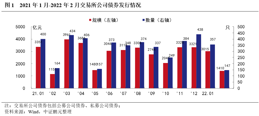 2022年2月份,交易所市场共发行信用债券155只,发行规模1,709.10亿元;发行数量和发行规模环比分别下降57%和45%,同比分别下降8%和增长45%。其中,公募公司债发行70只,发行规模843.05亿元,环比分别下降48%和46%,同比分别增长112%和120%;私募公司债发行77只,发行规模567.00亿元,环比分别下降65%和61%,同比分别下降41%和26%。交易所公司债净融资723.88亿元,环比下降53%。