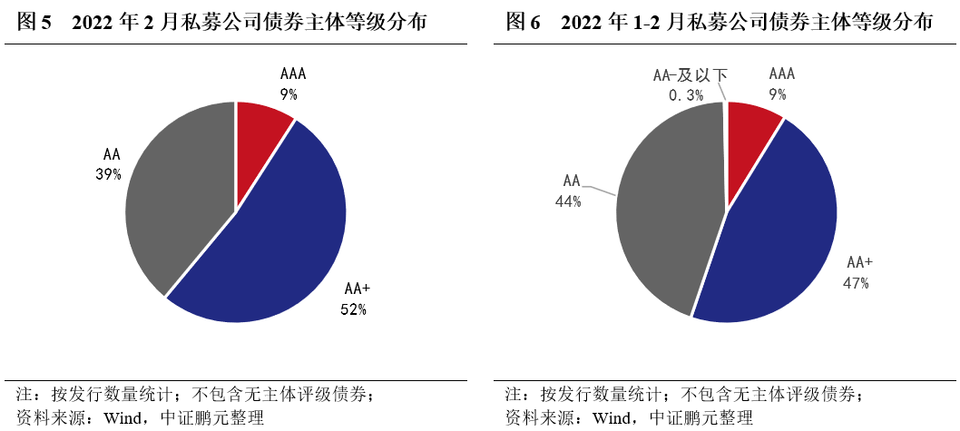 综合2022年1-2月份的情况来看,交易所公司债券主体级别仍以中高等级为主,AAA级、AA+级、AA级主体评级占比分别为37%、35%、27%。其中,公募公司债AAA级、AA+级、AA级及AA-及以下主体评级占比分别为77%、20%、3%,0.5%;私募公司债AAA级、AA+级、AA级及AA-及以下主体评级占比分别为9%、47%、44%、0.3%。