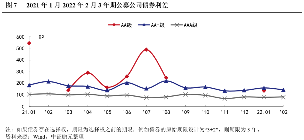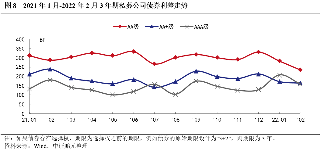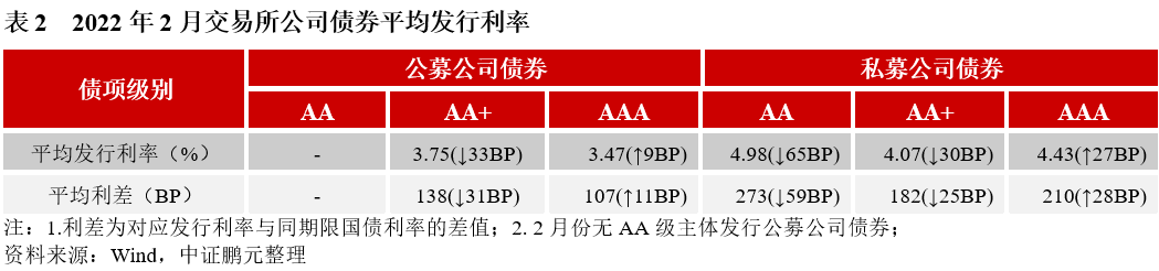 就发行利率而言,2022年2月份交易所公司债券的最高利率为8.0%,较上月最高利率下降50BP;最低发行利率为2.15%,较上月最低利率下降15BP。与1月份相比,公募公司债券方面,AAA级平均发行利率上行9BP、利差扩大11BP,AA+级平均发行利率下行33BP,利差收窄31BP;私募公司债券方面,AAA级平均发行利率上行27BP、利差扩大28BP,AA+级平均发行利率下行30BP,利差收窄25BP,AA级平均发行利率下行65BP、利差收窄59BP。AA+和AAA级私募公司债的发行利率和发行利差仍倒挂,但差值较上月收窄。