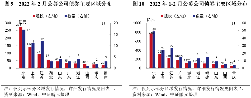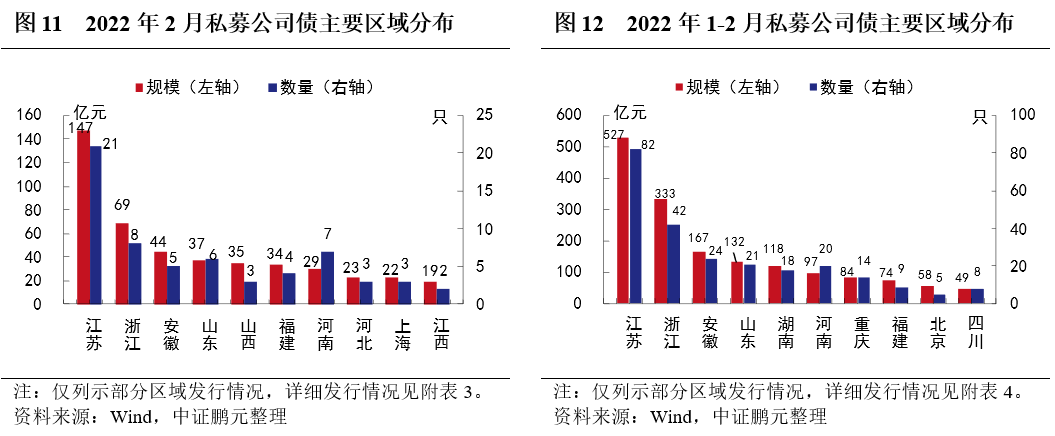 区域分布方面,2月份公募公司债券发行人以北京、上海、江苏地区为主,私募公司债主要分布在江苏、浙江、安徽地区。