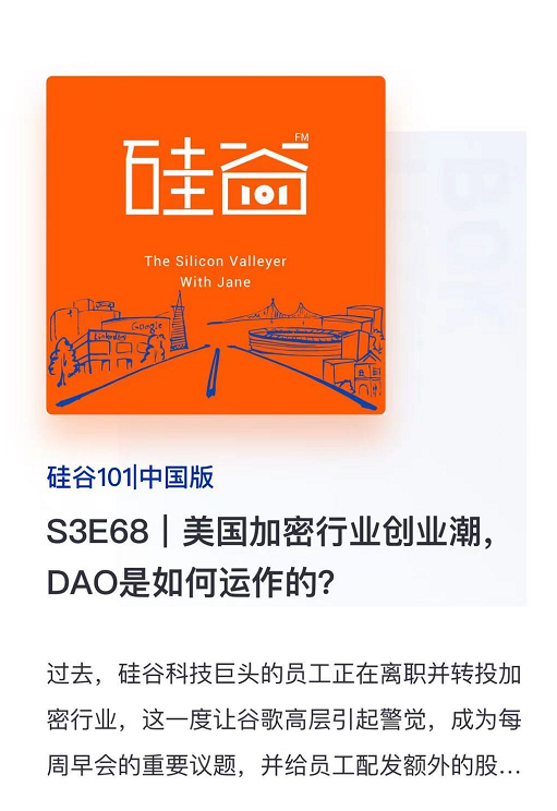 过去,硅谷科技巨头的员工正在离职并转投加密行业,这一度让谷歌高层引起警觉,成为每周早会的重要议题,并给员工配发额外的股票来挽留人才。关于加密货币的创业公司前景如何,这是一个很难回答也是很值得被回答的问题。《硅谷101》这一期节目“美国加密行业创业潮,DAO是如何运作的”,以嘉宾的经历,聊聊这个行业近期的发展。 也聊到之前大家在谈论互联网最新前沿DAO这些创新时候,这些创新是以怎样的方式来运作的,能给整体社会带来什么样福利。