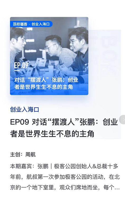 “对话摆渡人张鹏:创业者是世界生生不息的主角”这期节目中,周航聊到第一次参加极客公园(中国互联网创新者组织)的活动,在北京的一个地下室里,观众们席地而坐,每个“极客”都有机会上台讲几分钟,讲讲自己的创业想法或是见解。极客公园创始人及总裁张鹏请来的最大咖嘉宾是雷军,给大家讲了他想做手机的事。这个活动给周航留下了很深的印象,创业路上的点滴心得也在播客中分享给了用户。